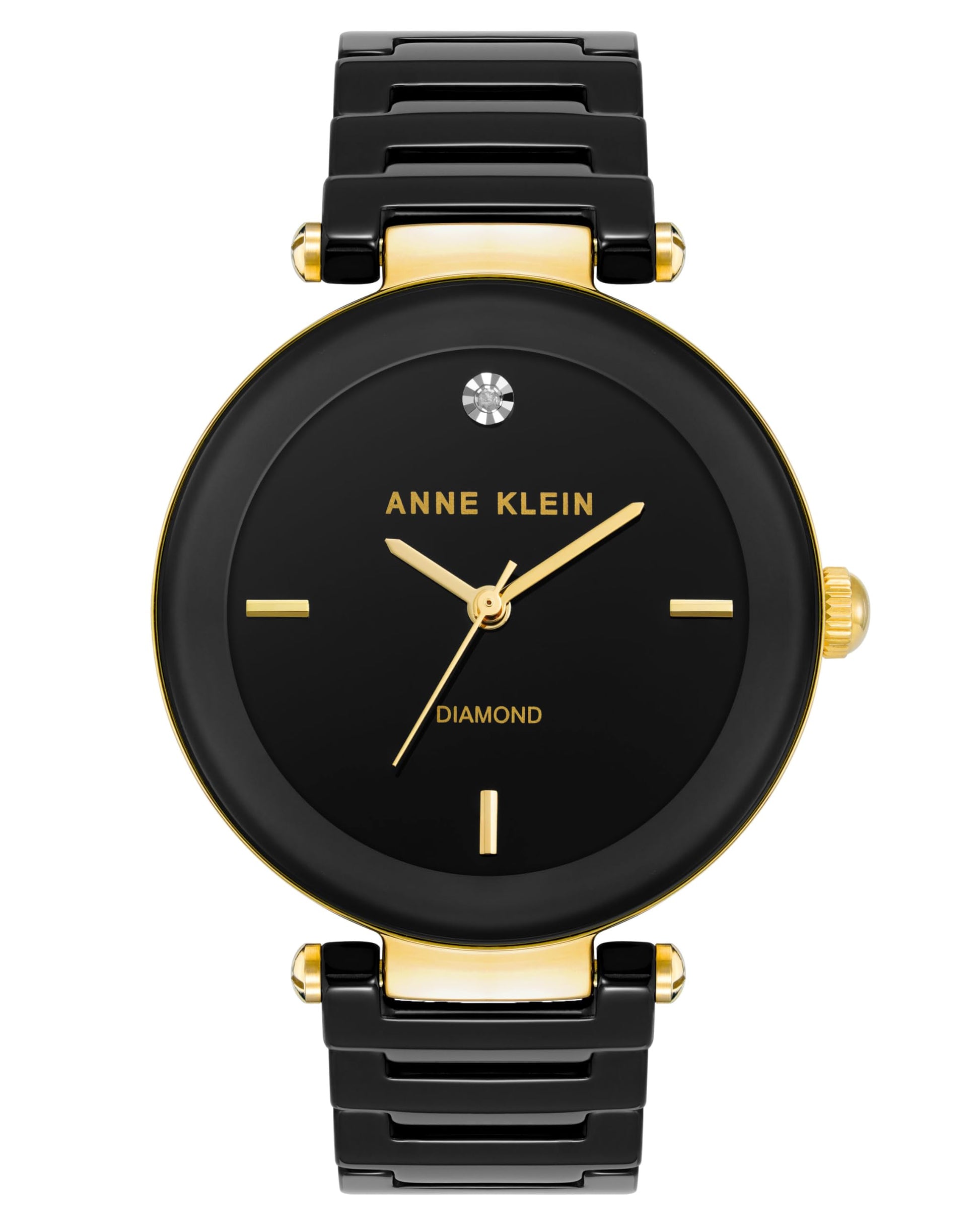 - Glossy black dial with genuine diamond at 12 o'clock with gold-tone markers at 3, 6 & 9 hours