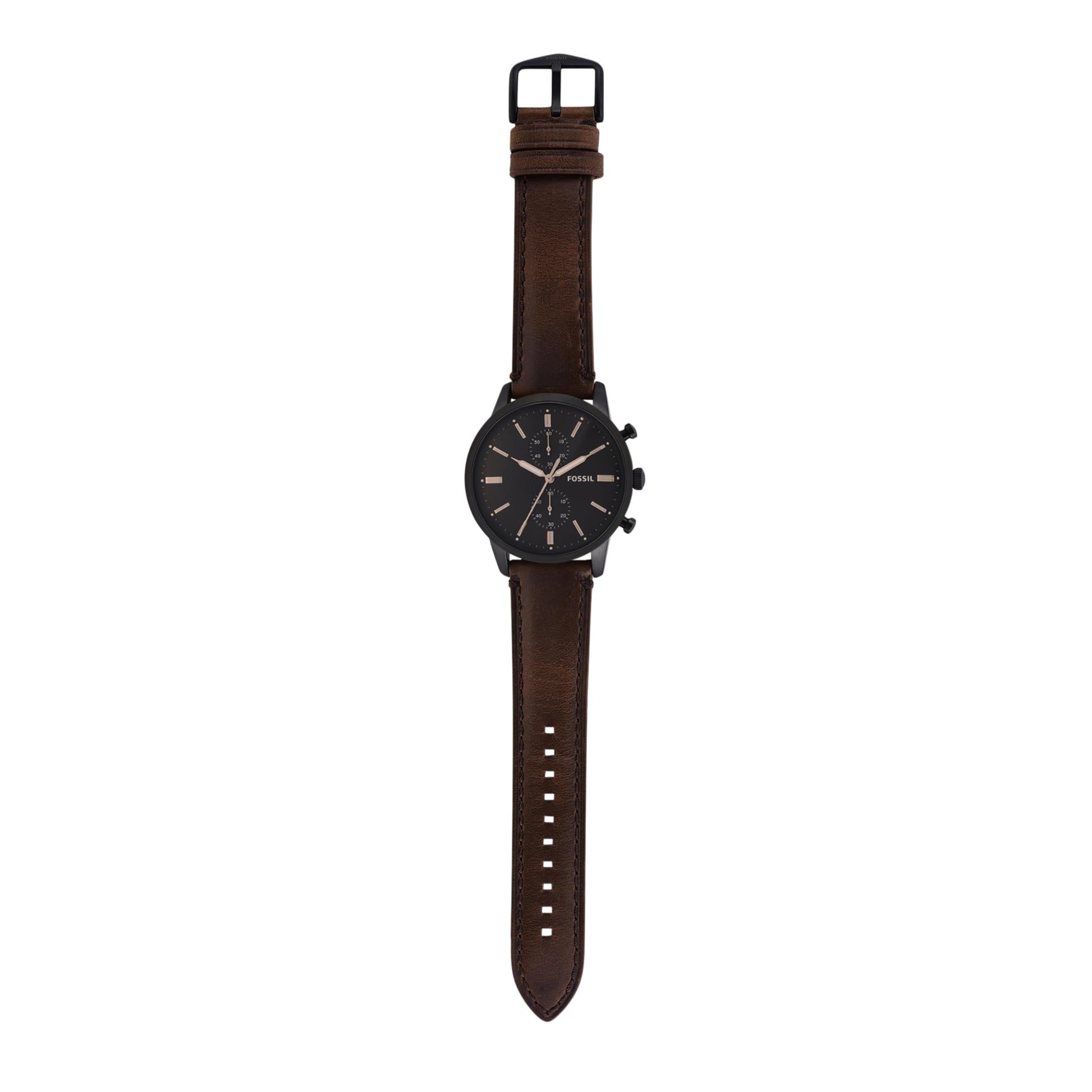 - Watch Band: Dark brown, genuine leather band with a secure adjustable buckle closure for a customized fit; interchangeable with all 22mm Fossil watch straps.