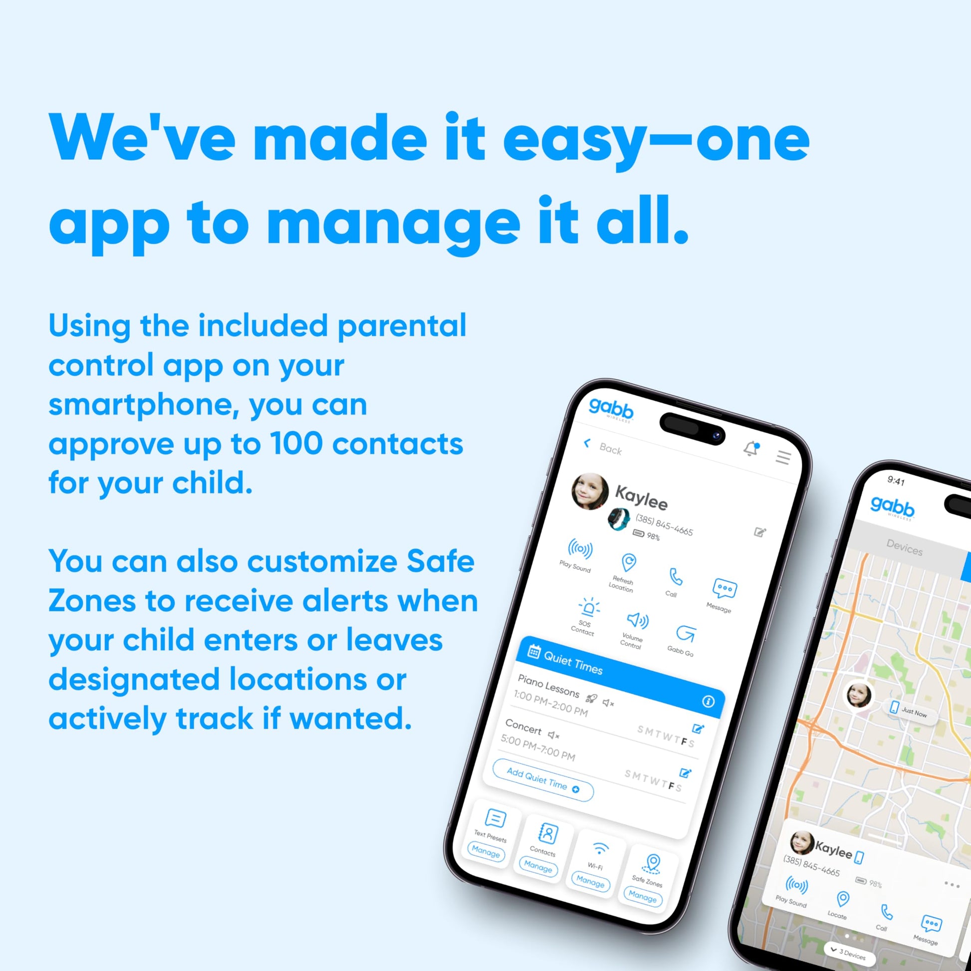 - Parental Control App: MyGabb app puts you in charge to approve contacts, monitor kids text messages, track your child's location with GPS, receive SOS alerts, schedule Focus Time for school, create Safe Zones, and more. Tailor the experience to your child's needs.