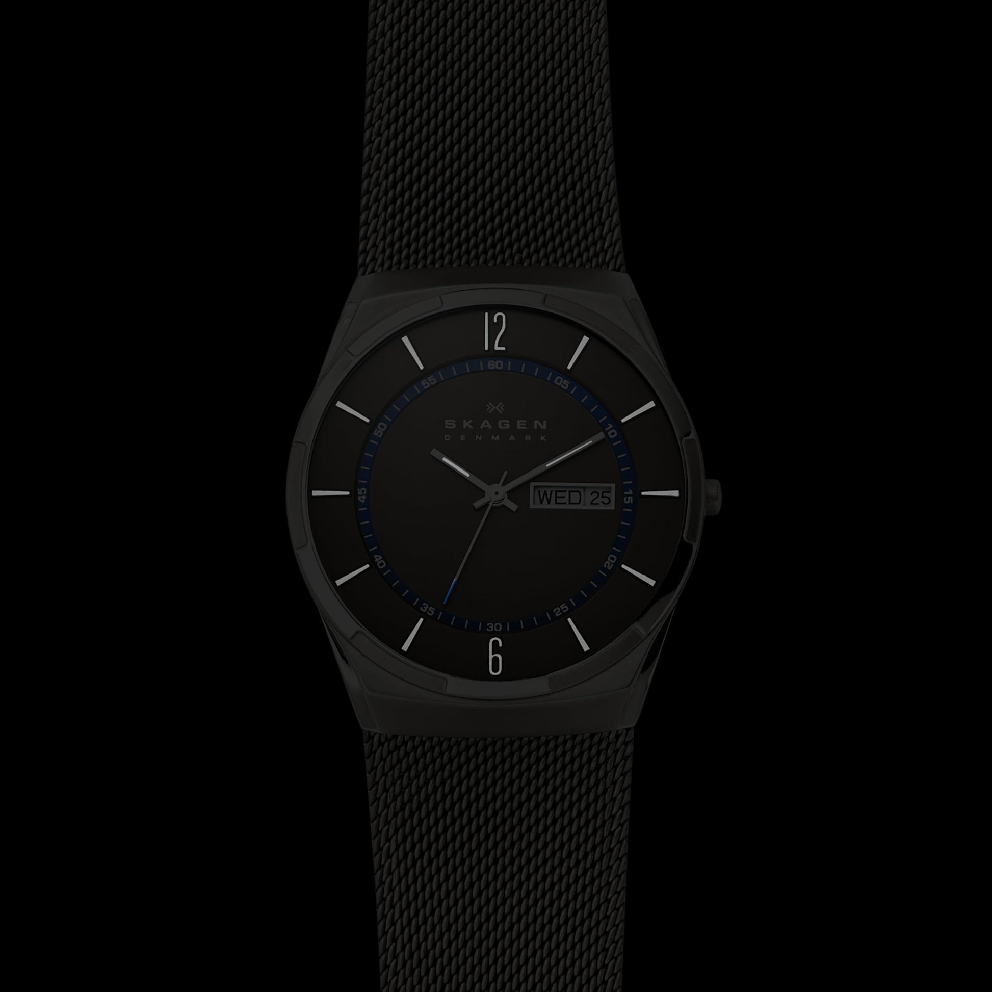 - Editor's Notes: This 40mm Melbye Titanium features a matte dial with three-hand movement. Numerals are at the 12 o'clock and 6 o'clock positions while linear indexes mark each hour. An inner ring of numerals keeps track of seconds and a unique rectangular display shows the day and date. It is finished with a 28mm steel mesh strap.