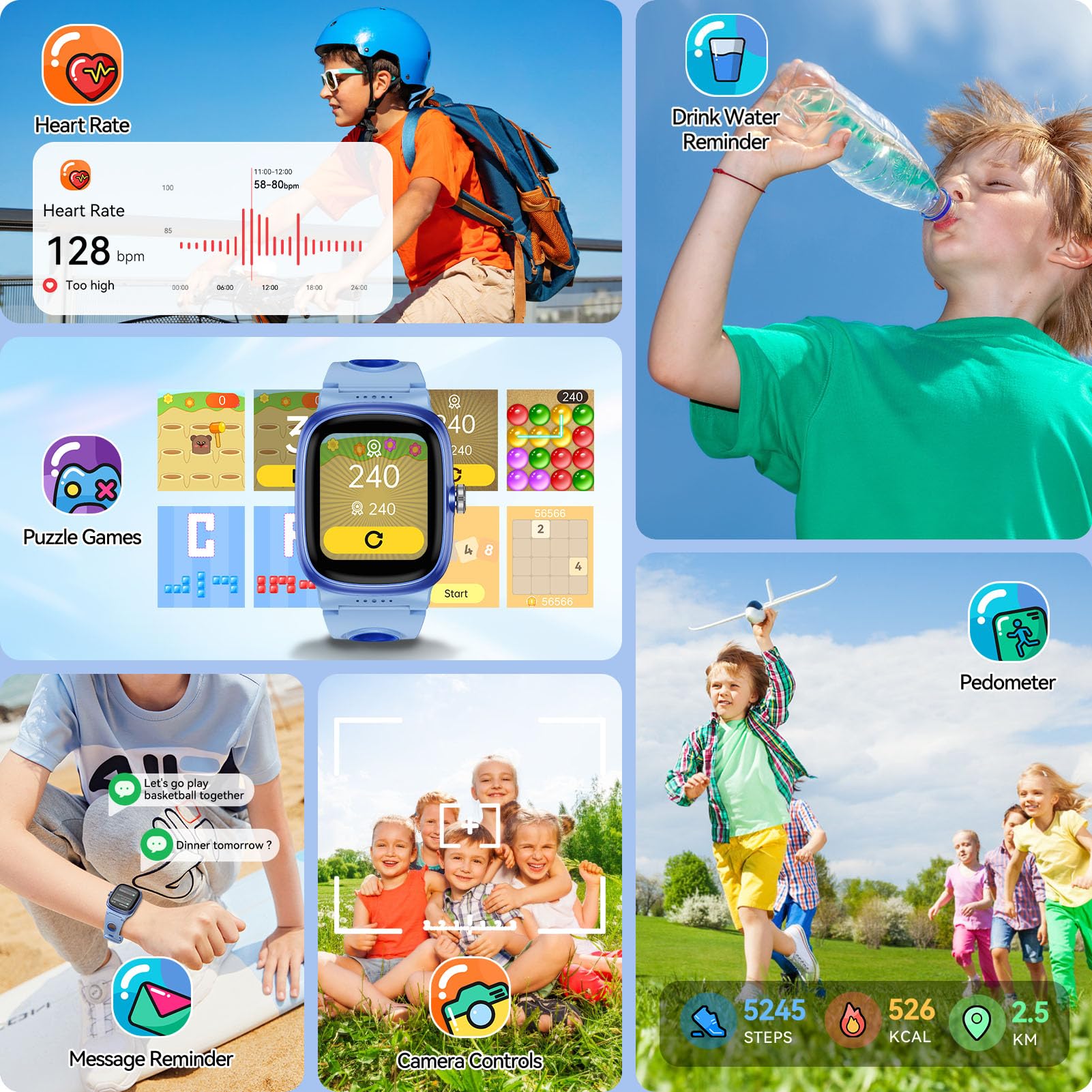 - 📚【All-in-One Fun & Learning Kids Watch】The smart watch for kids combines entertainment and education. With 8 engaging puzzle games and 200+ customizable watch faces, keep kids entertained while enhancing their cognitive skills. This smartwatch is a perfect blend of fun and functionality, whether it's tracking their activities, taking photos, or simply telling time, your child will love the endless possibilities