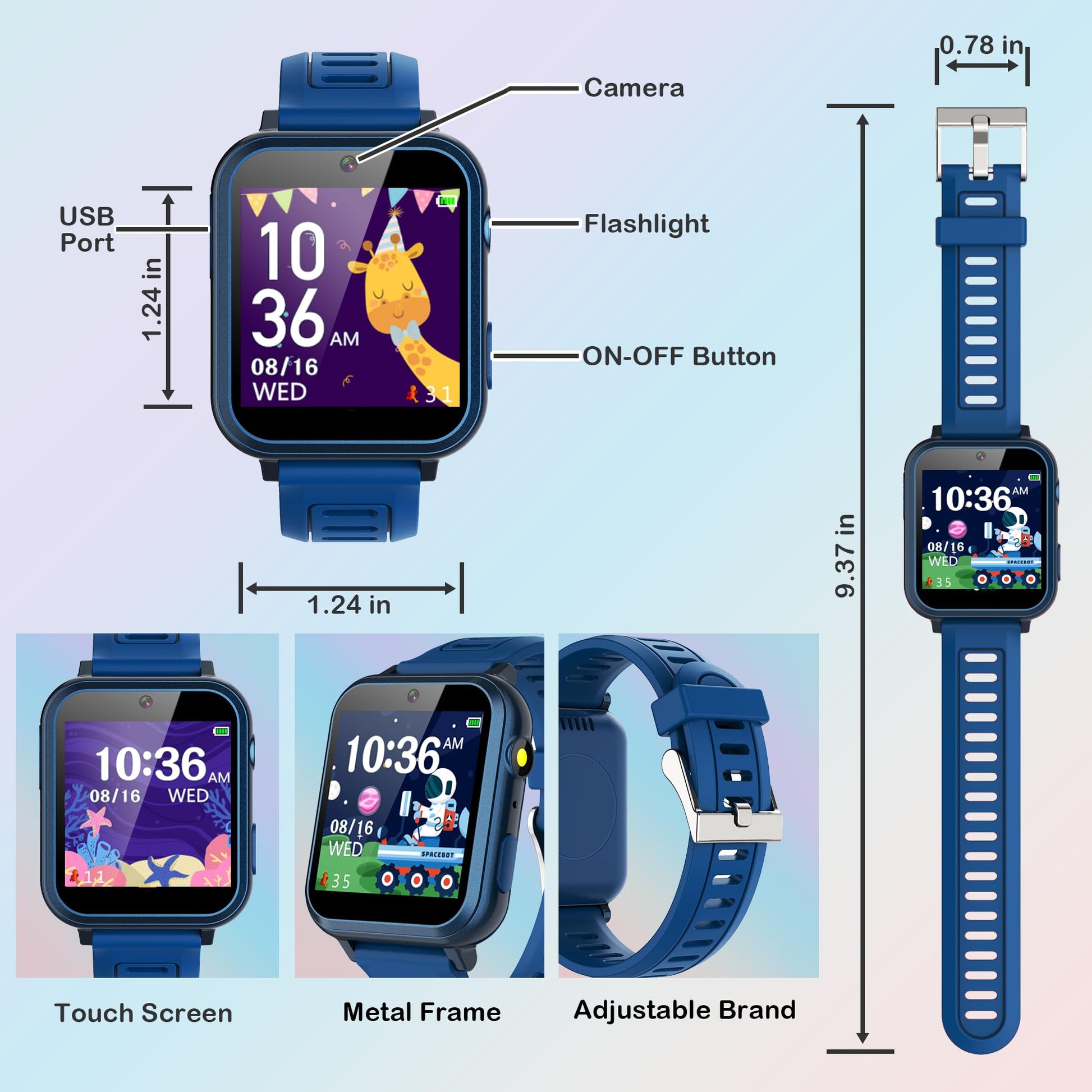 - ⌚【Multi-Functional Kids Smart Watch】The kids smart watch boys comes with rich functions including camera, 24 games, pedometer, flashlight, stopwatch, video, alarms clock, music player, calculator, school mode, recording, calendar, video record, habit tracking, learning cards and audio stories etc. This watch for boys not only facilitates children's lives but also adds fun to them. It's a great toys for boys 6-8.